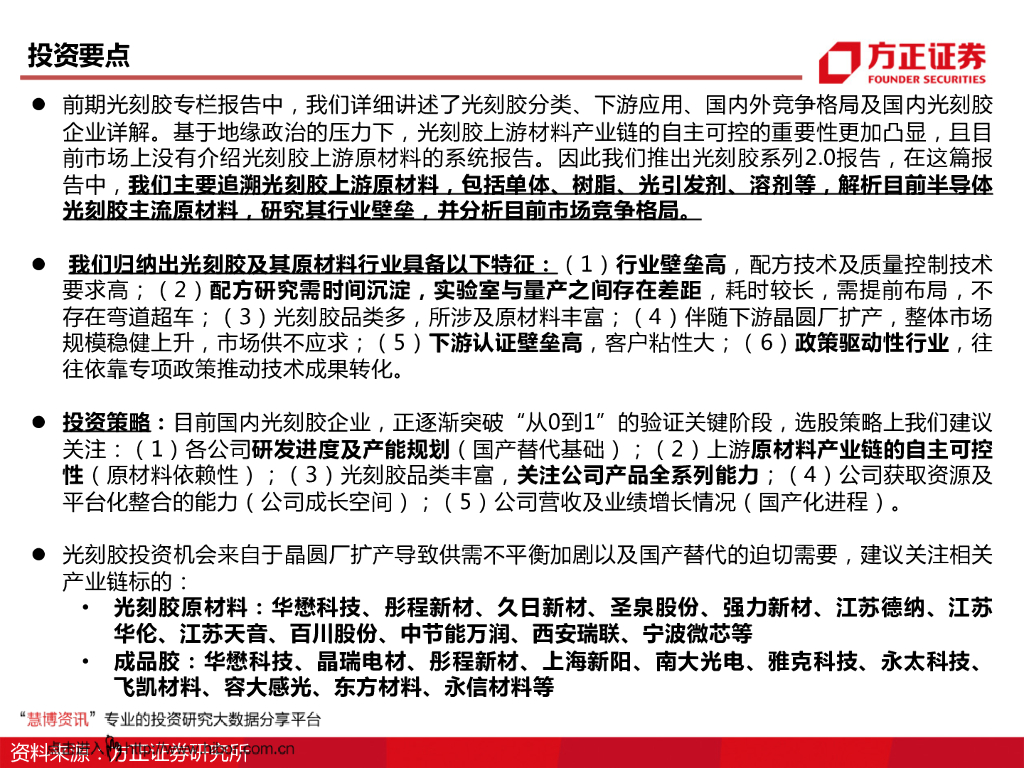 方正证券:电子行业深度报告:光刻胶研究框架2.0,详解上游单体、树脂、光酸、光引发剂.pdf