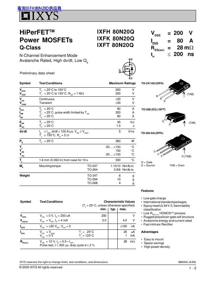 IXYS IXFH 80N20Q IXFK 80N20Q IXFT 80N20Q 数据手册.pdf