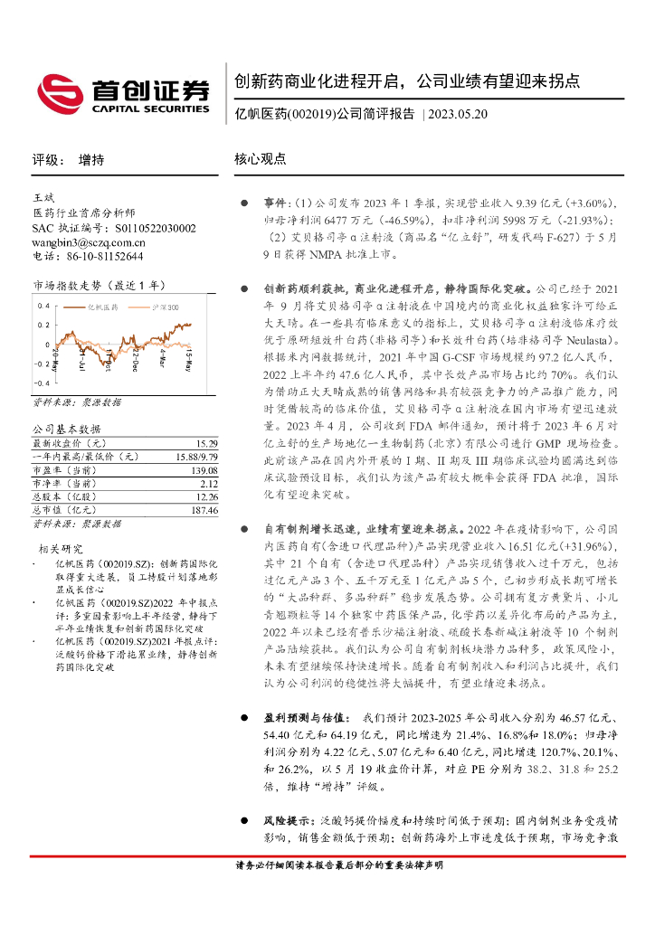 首创证券:亿帆医药(002019)-公司简评报告:创新药商业化进程开启,公司业绩有望迎来拐点.pdf
