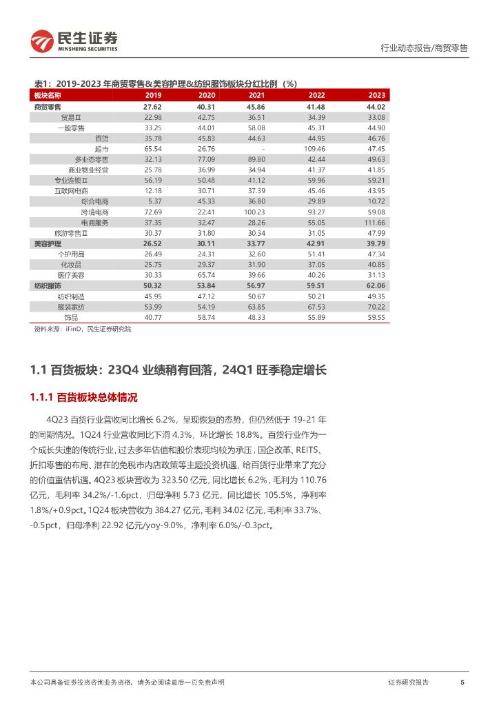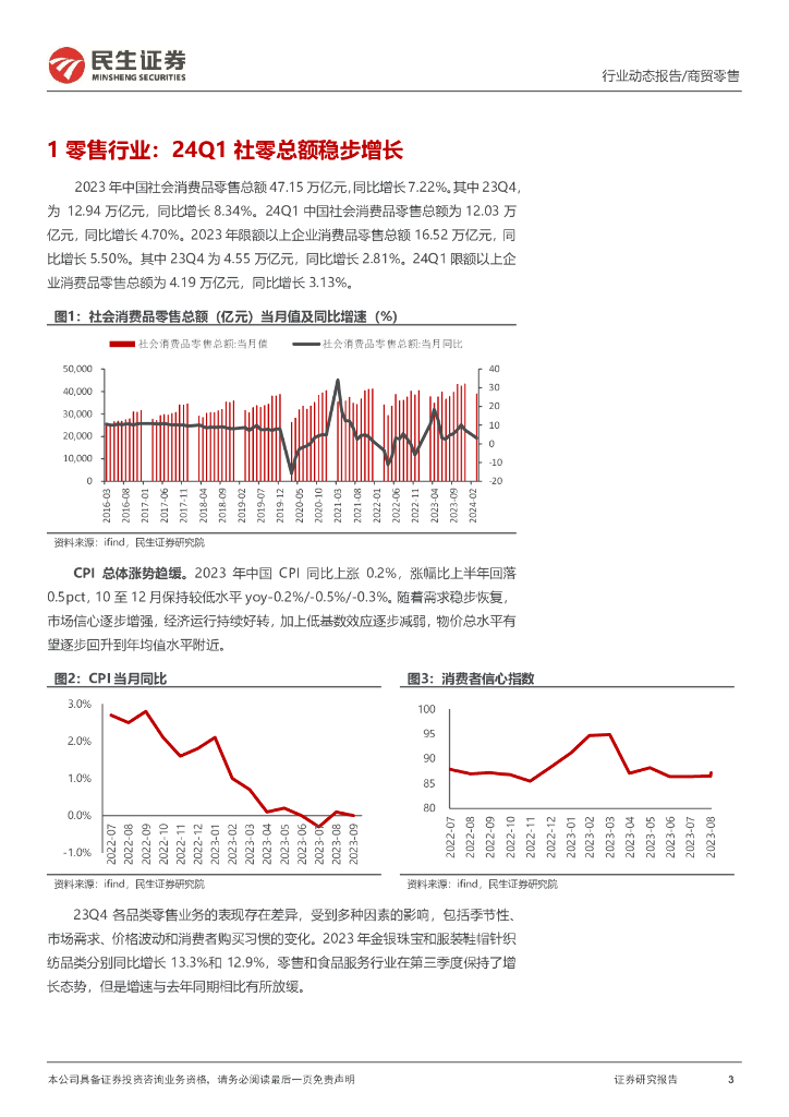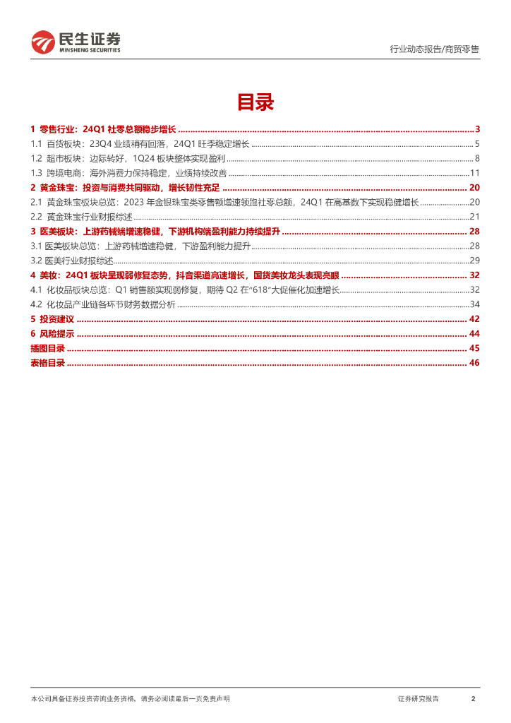 民生证券:商贸零售行业2023年年报及2024年一季报业绩综述:美妆国货龙头加速崛起,跨境电商&黄金珠宝&医美龙头增速稳健.pdf