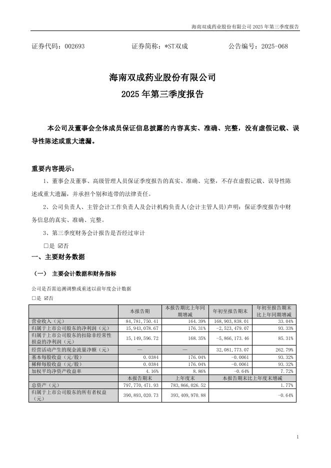 002693-*ST双成:2025年三季度报告.pdf