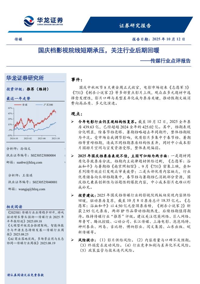 华龙证券:传媒行业点评报告:国庆档影视院线短期承压,关注行业后期回暖.pdf