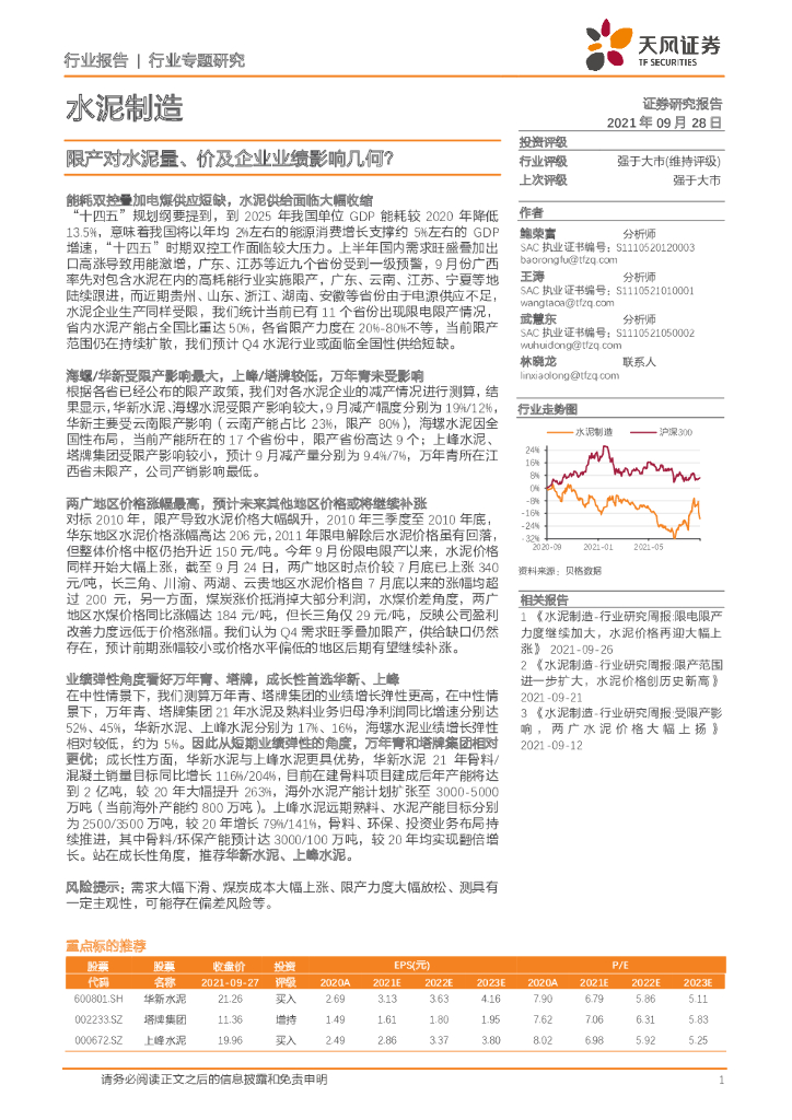 天风证券:水泥制造行业专题研究:限产对水泥量、价及企业业绩影响几何?.pdf