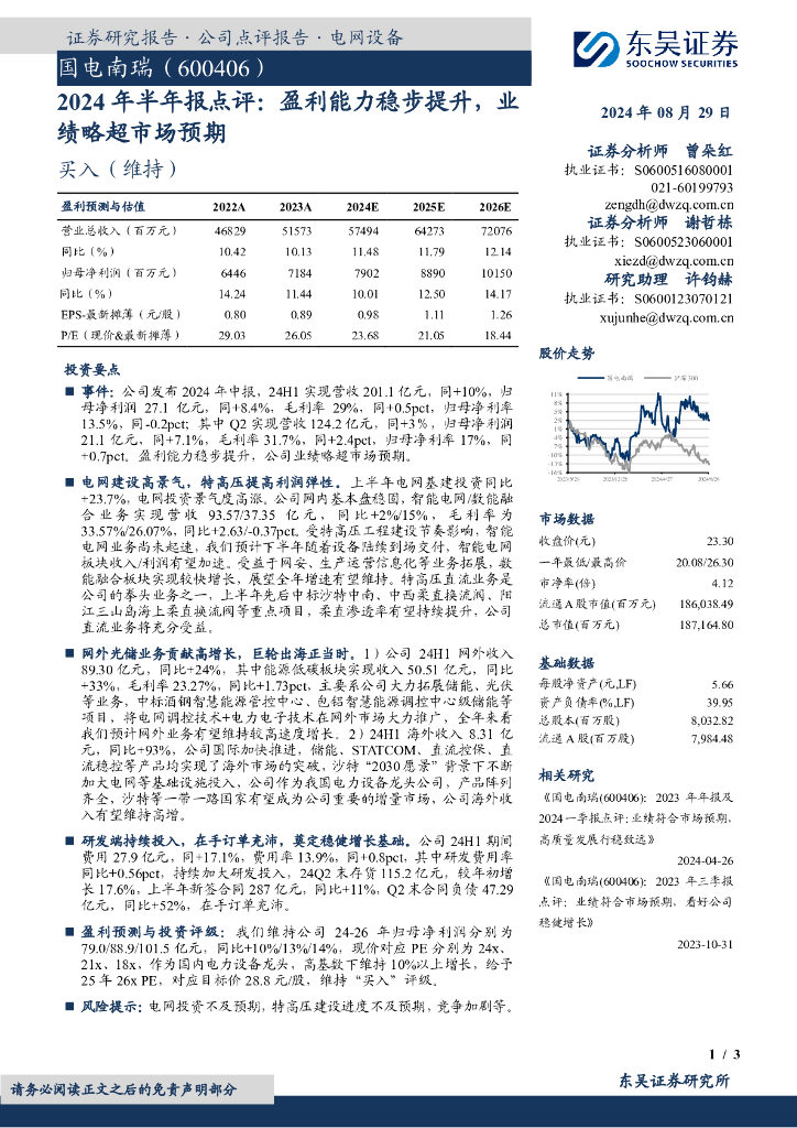 东吴证券:国电南瑞(600406)-2024年半年报点评:盈利能力稳步提升,业绩略超市场预期.pdf
