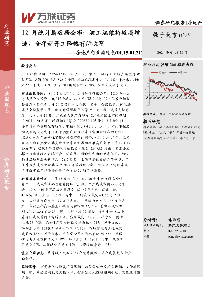 万联证券:房地产行业周观点:12月统计局数据公布:竣工端维持较高增速,全年新开工降幅有所收窄.pdf