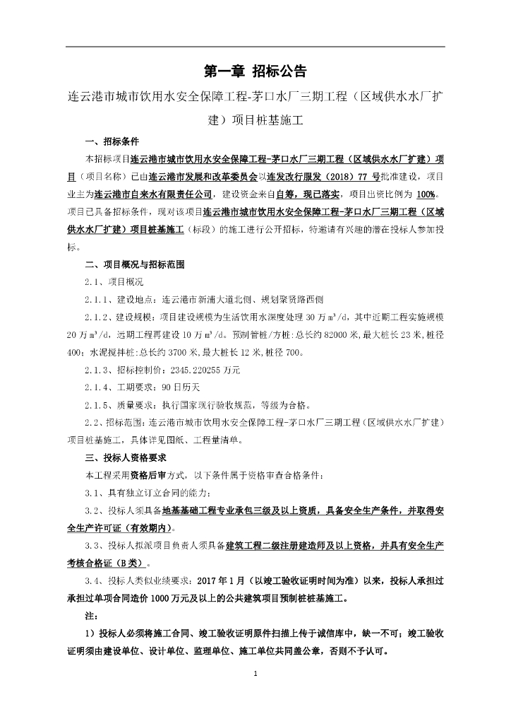 连云港市城市饮用水安全保障工程——茅口水厂三期工程(区域供水水厂扩建)项目桩基施工(招标文件).pdf
