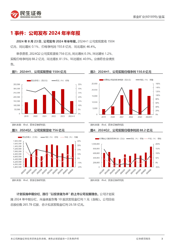 民生证券:紫金矿业(601899)-2024年半年报深度点评:降本增效见成效,三大铜矿产业集群齐绽放.pdf