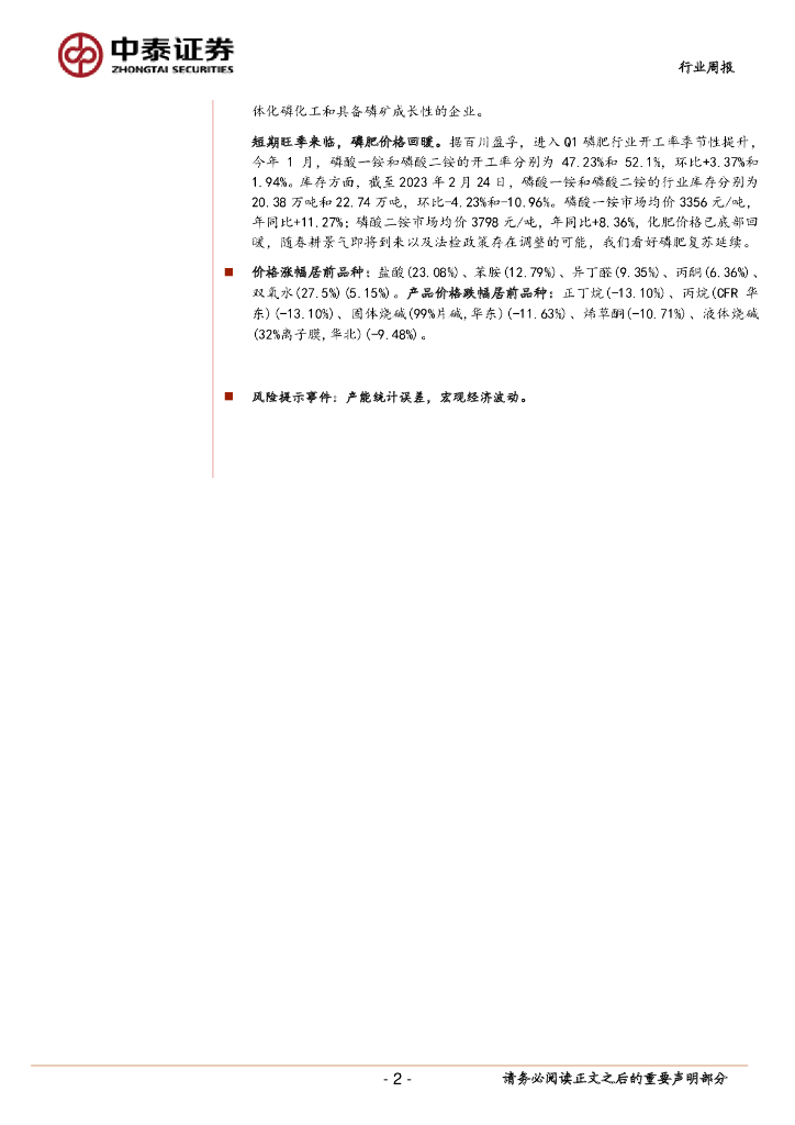 中泰证券:化工周度观点23W8:春耕来临磷肥回暖,磷矿紧平衡价格上行.pdf