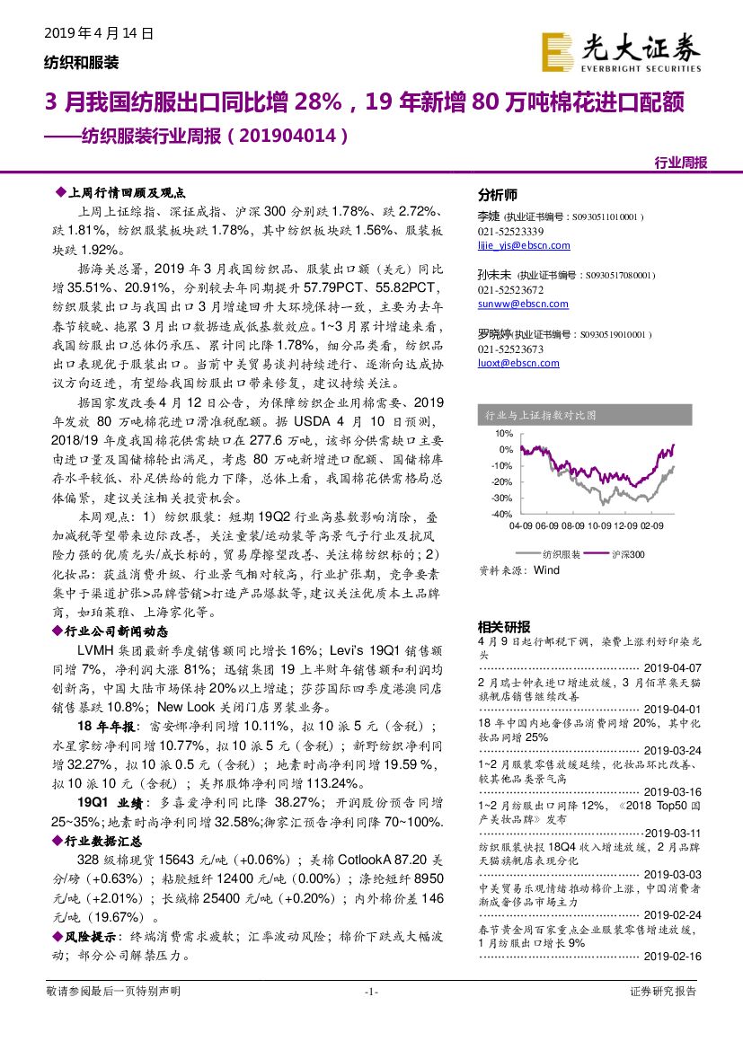 光大证券:纺织服装行业周报:3月我国纺服出口同比增28%,19年新增80万吨棉花进口配额.pdf