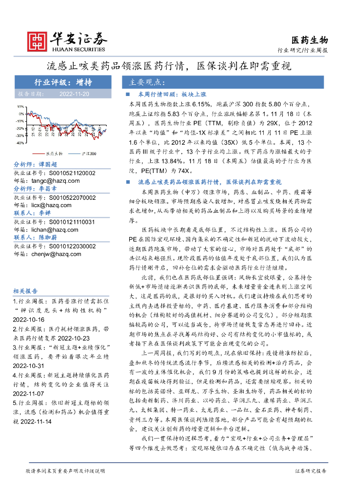 华安证券:医药生物行业周报:流感止咳类药品领涨医药行情,医保谈判在即需重视.pdf