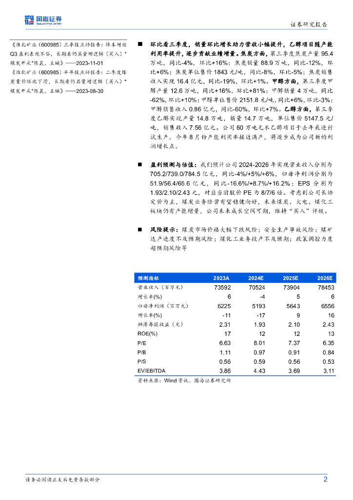 国海证券:淮北矿业(600985)-2024年三季报点评:三季度煤化工销量环比增长,乙醇逐步贡献业绩增量.pdf