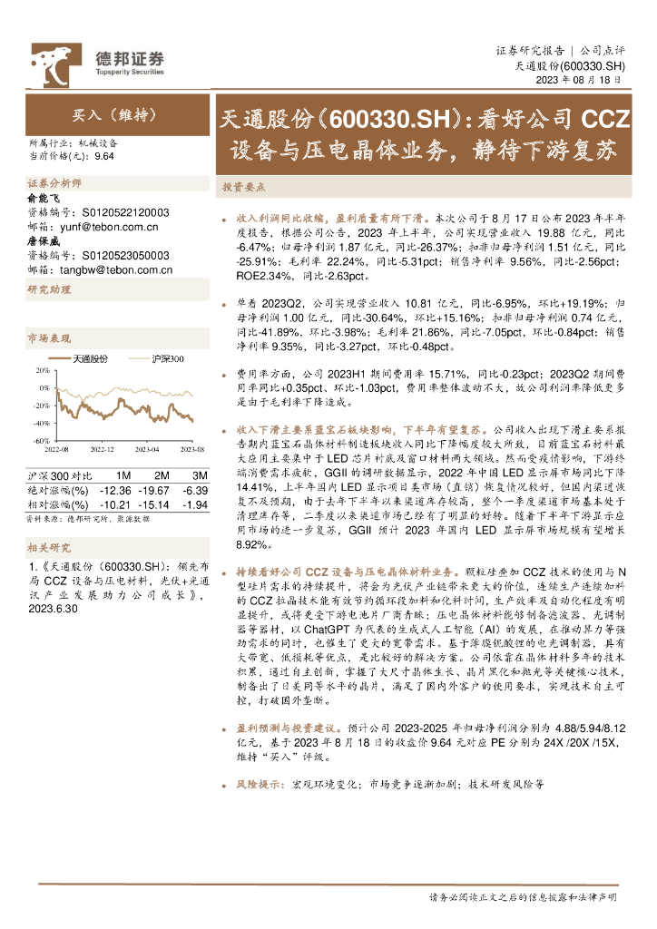 德邦证券:天通股份(600330)-看好公司CCZ设备与压电晶体业务,静待下游复苏.pdf