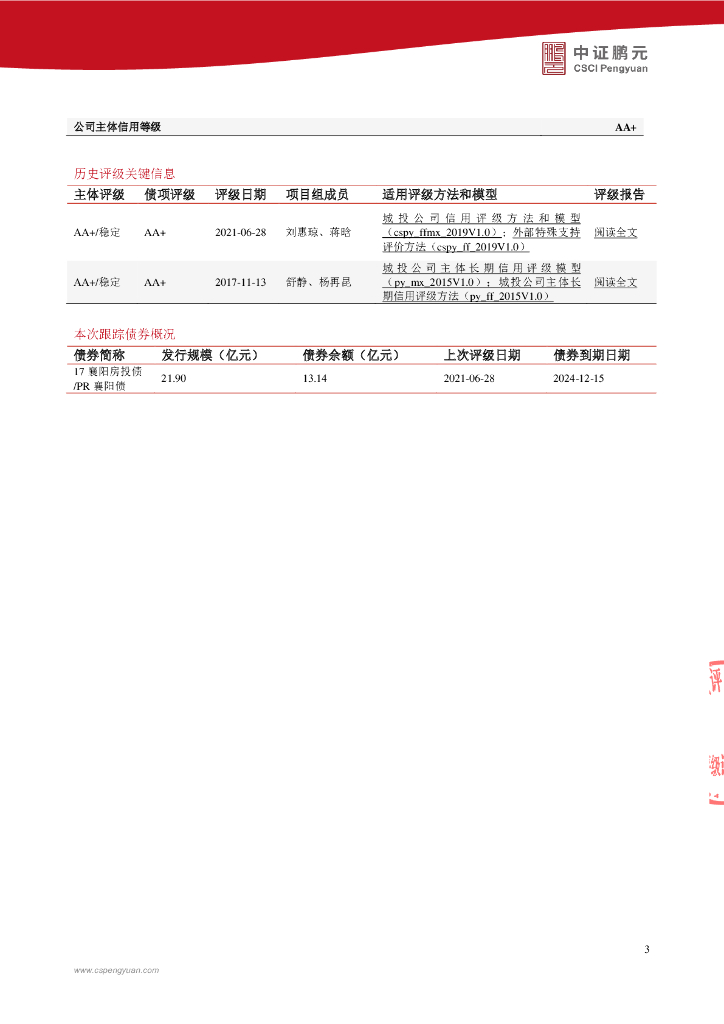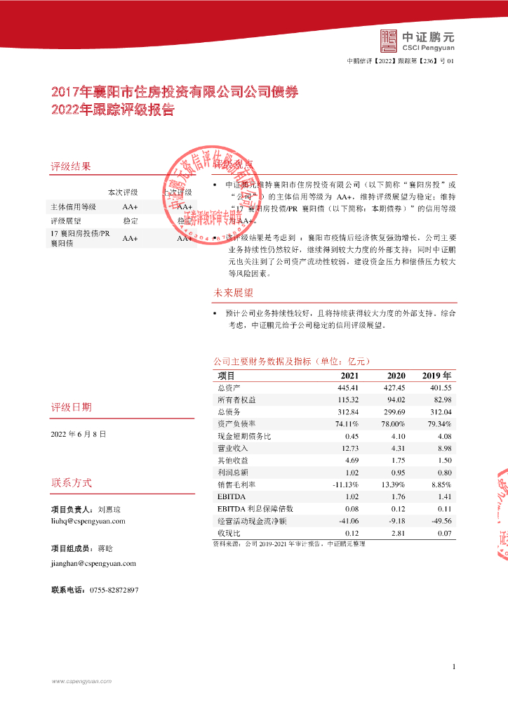 鹏元:2017年襄阳市住房投资有限公司公司债券2022年跟踪评级报告.pdf
