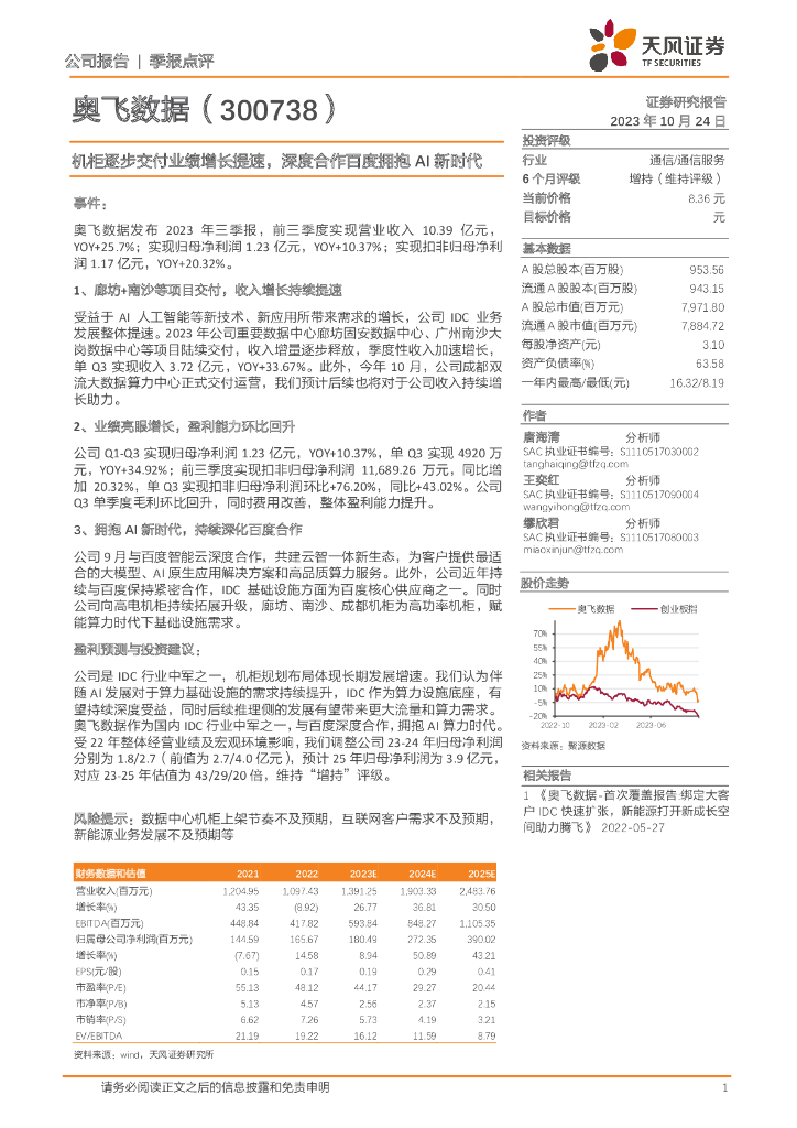 天风证券:奥飞数据(300738)-机柜逐步交付业绩增长提速,深度合作百度拥抱AI新时代.pdf