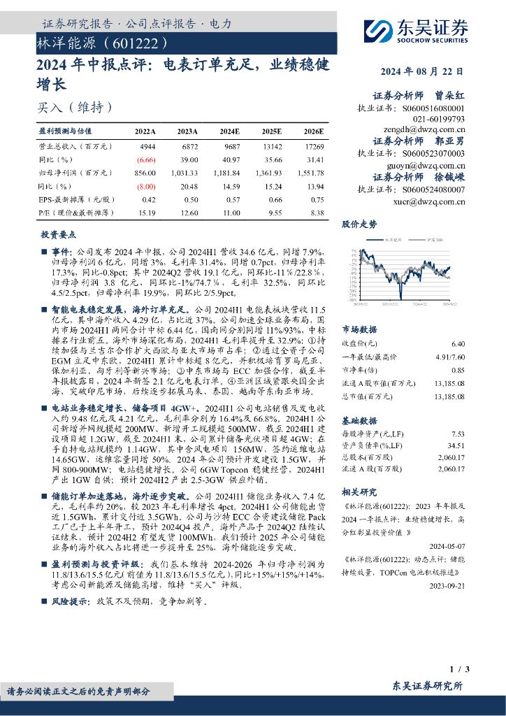 东吴证券:林洋能源(601222)-2024年中报点评:电表订单充足,业绩稳健增长.pdf