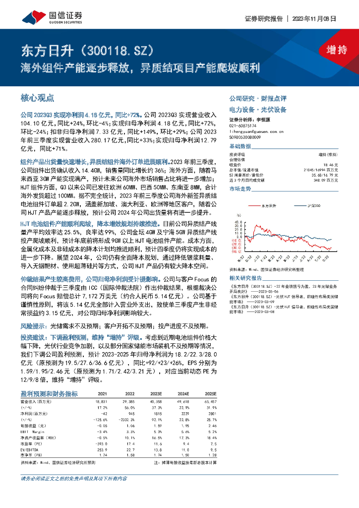 国信证券:东方日升(300118)-海外组件产能逐步释放,异质结项目产能爬坡顺利.pdf