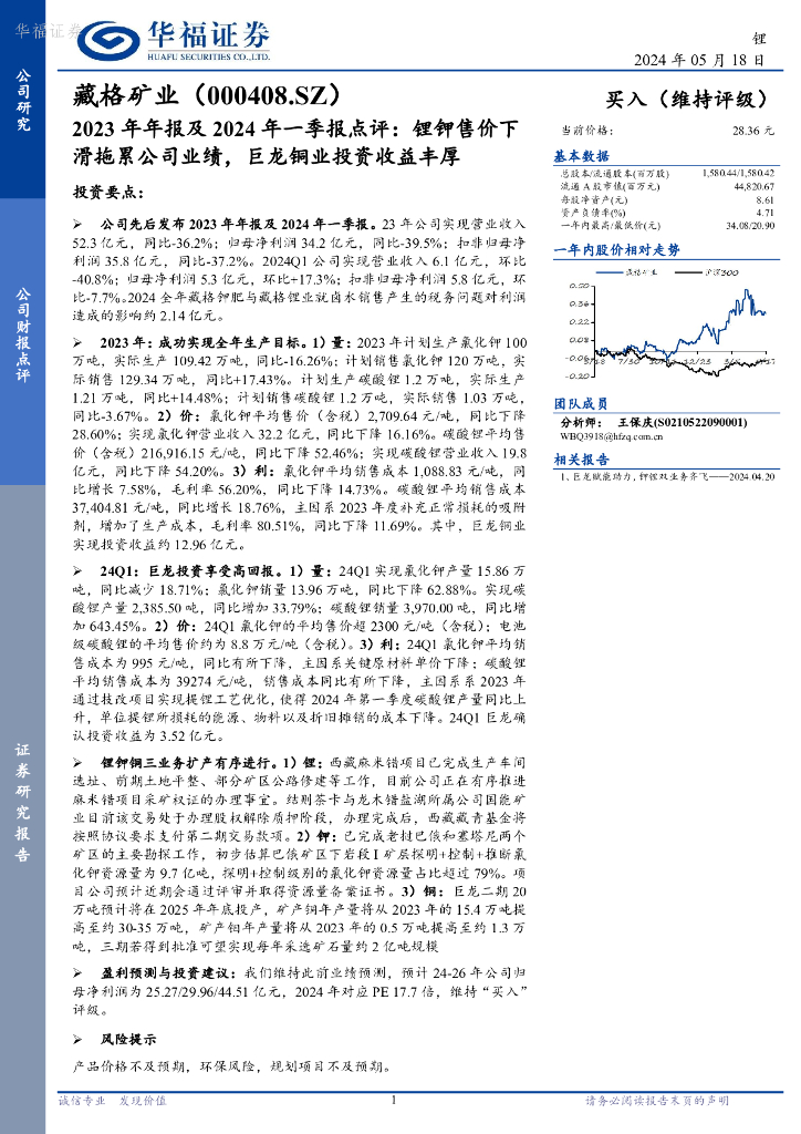 华福证券:藏格矿业(000408)-2023年年报及2024年一季报点评:锂钾售价下滑拖累公司业绩,巨龙铜业投资收益丰厚.pdf