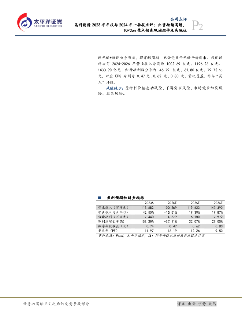 太平洋证券:晶科能源2023年年报与2024年一季报点评:出货持续高增,TOPCon技术领先巩固组件龙头地位.pdf