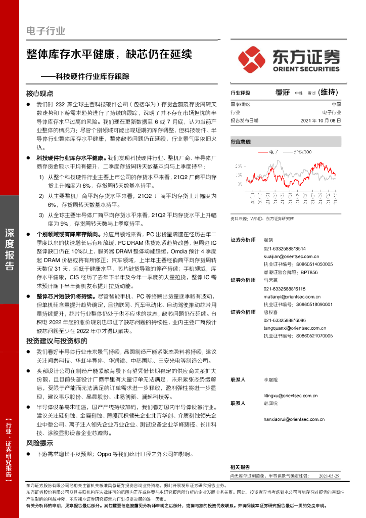 东方证券:科技硬件行业库存跟踪:整体库存水平健康,缺芯仍在延续.pdf