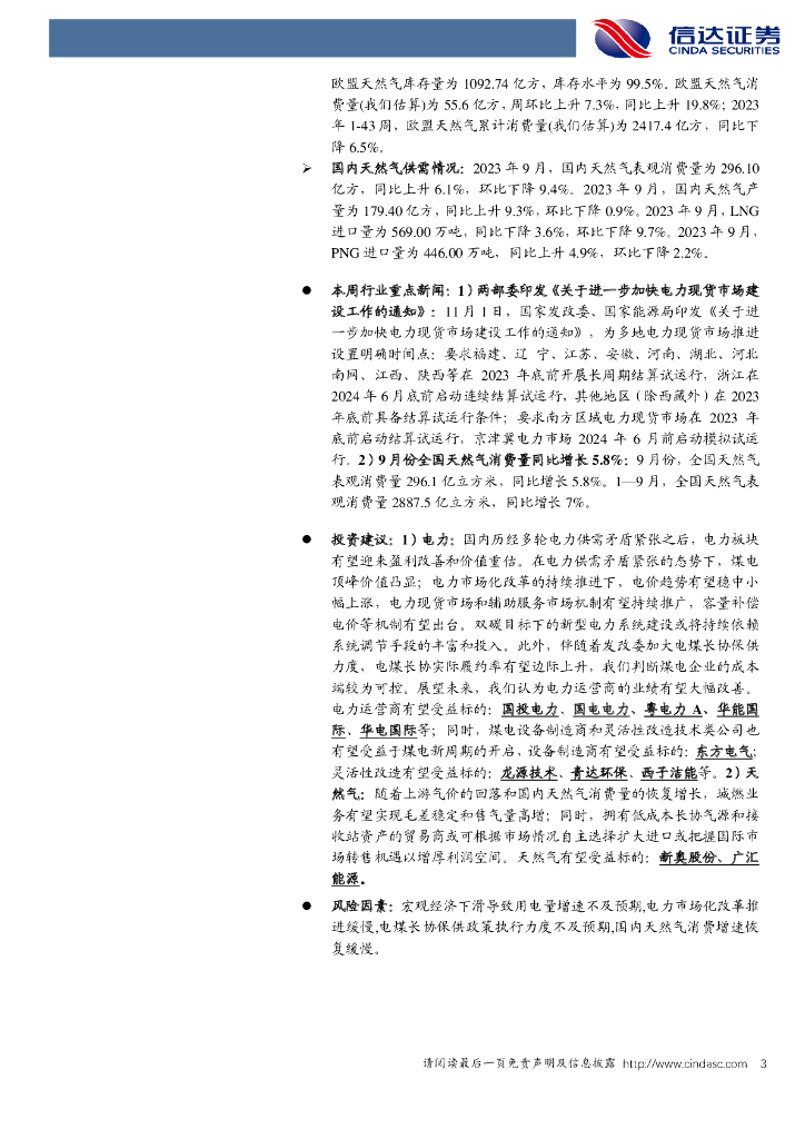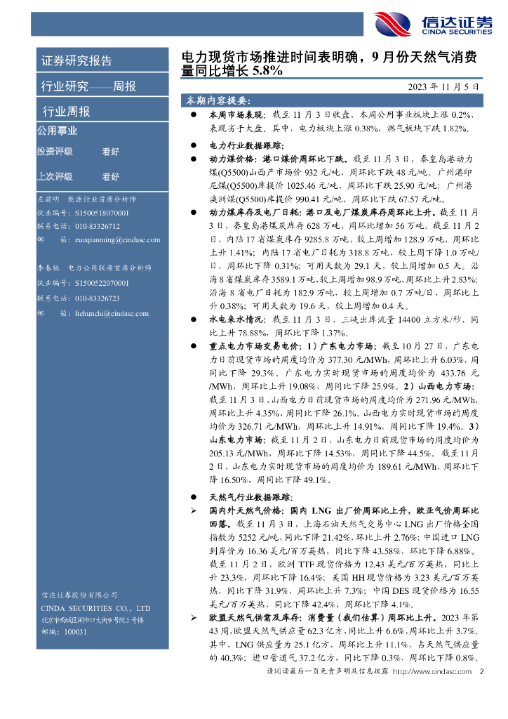 信达证券:公用事业—电力天然气周报:电力现货市场时间表明确,9月份天然气消费量同比增长5.8%.pdf
