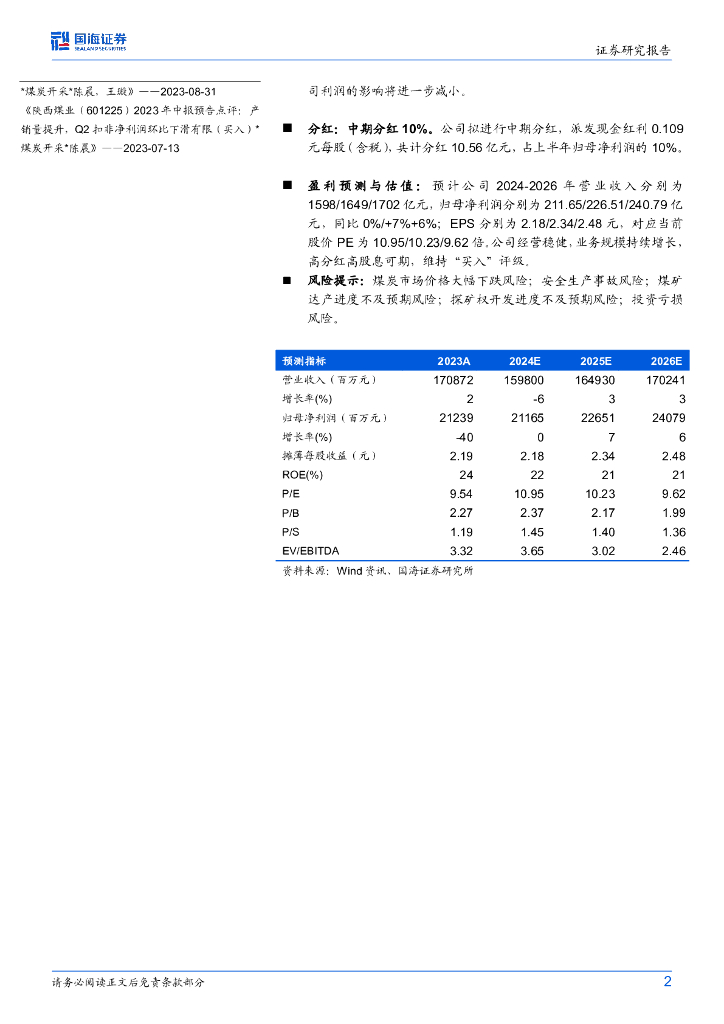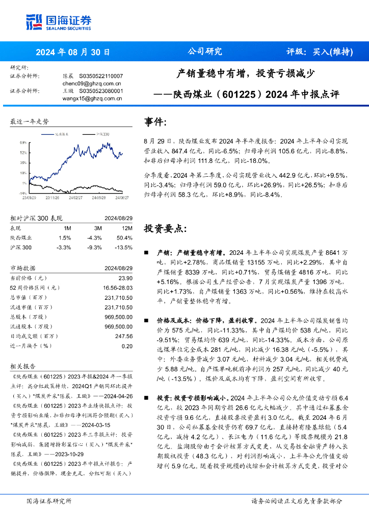 国海证券:陕西煤业(601225)-2024年中报点评:产销量稳中有增,投资亏损减少.pdf
