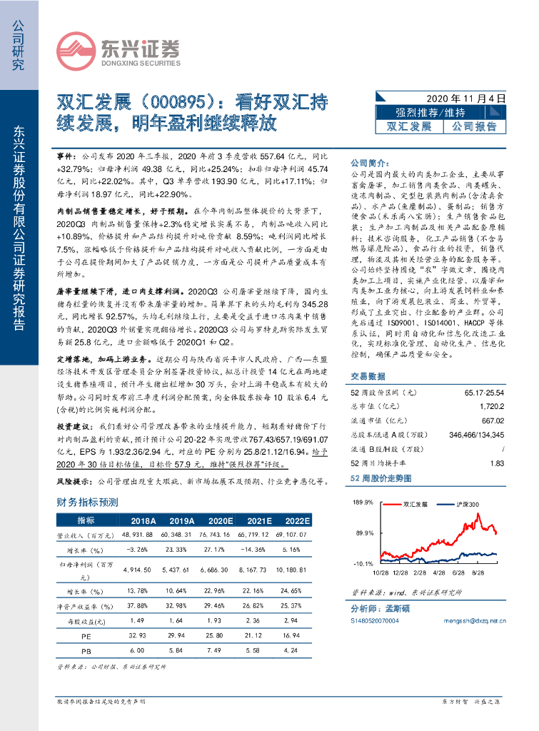 东兴证券:双汇发展(000895)-看好双汇持续发展,明年盈利继续释放.pdf