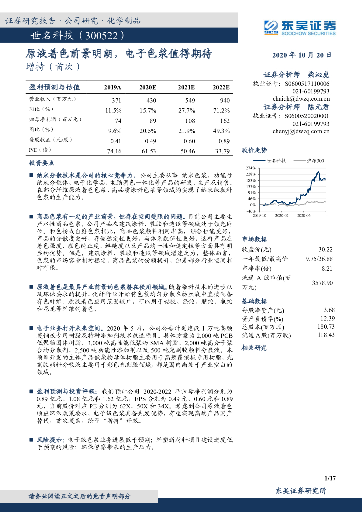 东吴证券:世名科技(300522)-原液着色前景明朗,电子色浆值得期待.pdf