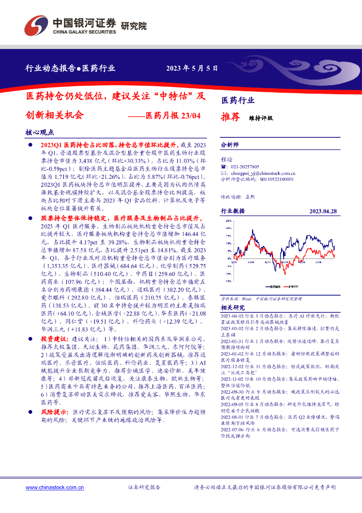 中国银河:医药月报23/04:医药持仓仍处低位,建议关注“中特估”及创新相关机会.pdf