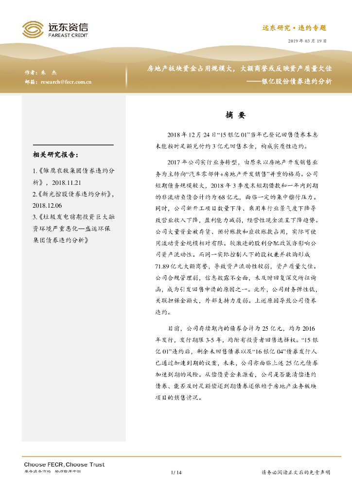 远东资信:银亿股份债券违约分析——房地产板块资金占用规模大,大额商誉或反映资产质量欠佳.pdf