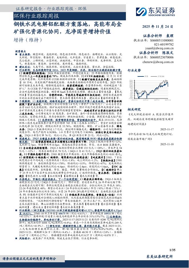 东吴证券:环保行业跟踪周报:钢铁水泥电解铝配额方案落地,高能布局金矿强化资源化协同,龙净国资增持价值.pdf