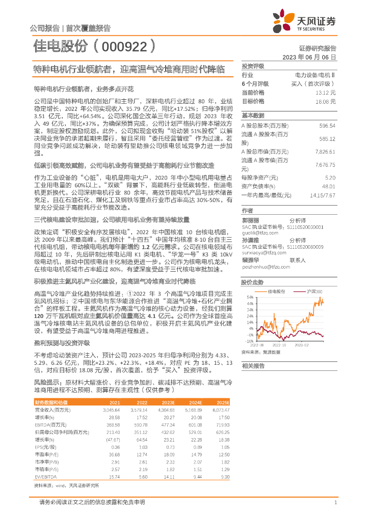天风证券:佳电股份(000922)-特种电机行业领航者,迎高温气冷堆商用时代降临.pdf
