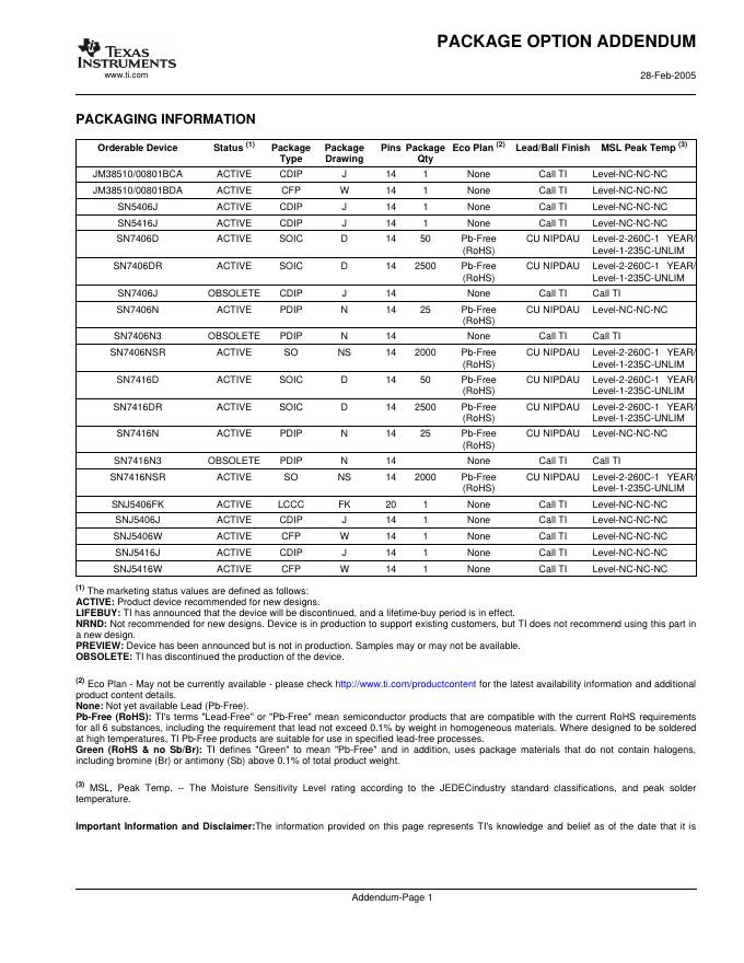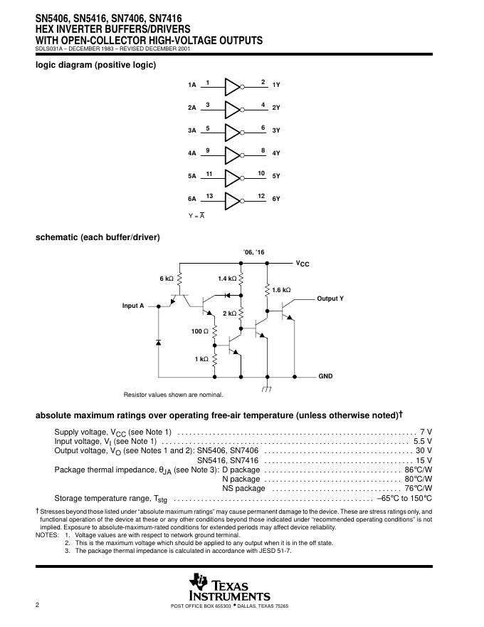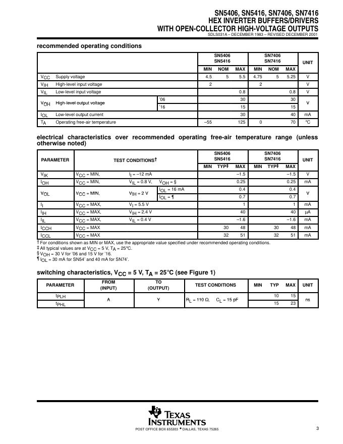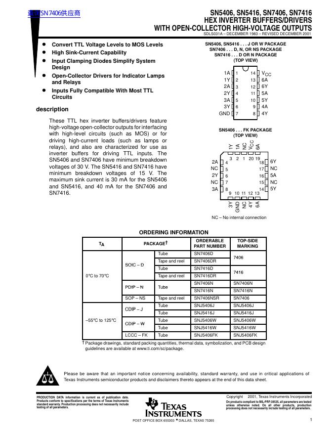 TEXAS INSTRUMENTS SN5406, SN5416, SN7406, SN7416 HEX INVERTER BUFFERS/DRIVERS WITH OPEN-COLLECTOR HIGH-VOLTAGE OUTPUTS 数据手册.pdf