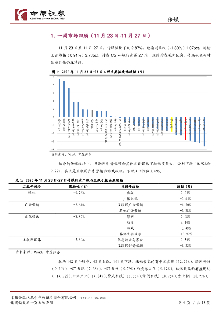 中原证券:传媒行业周报:预计12月电影市场改善明显,推荐游戏、电影板块.pdf