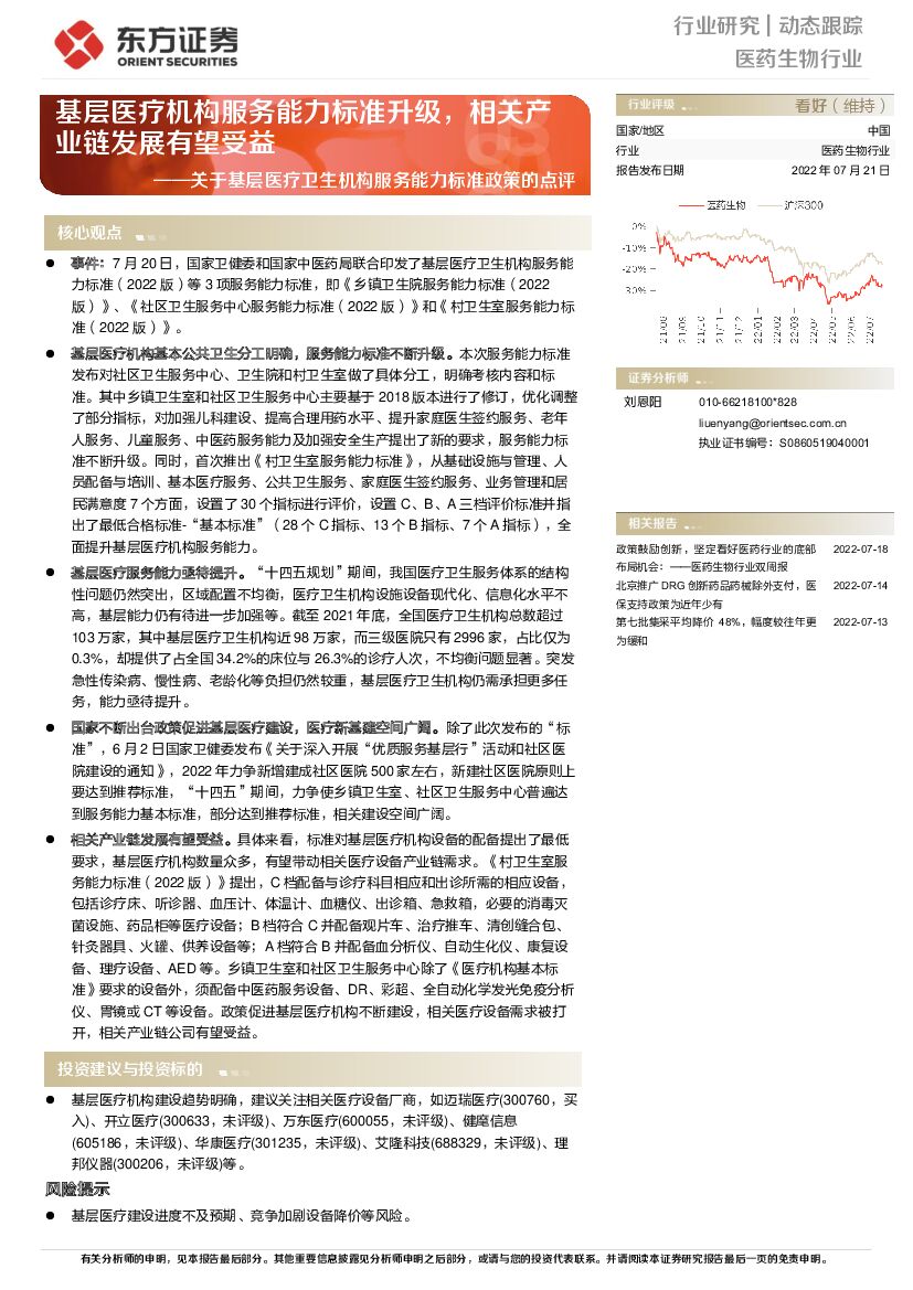 东方证券:医药生物行业关于基层医疗卫生机构服务能力标准政策的点评:基层医疗机构服务能力标准升级,相关产业链发展有望受益.pdf