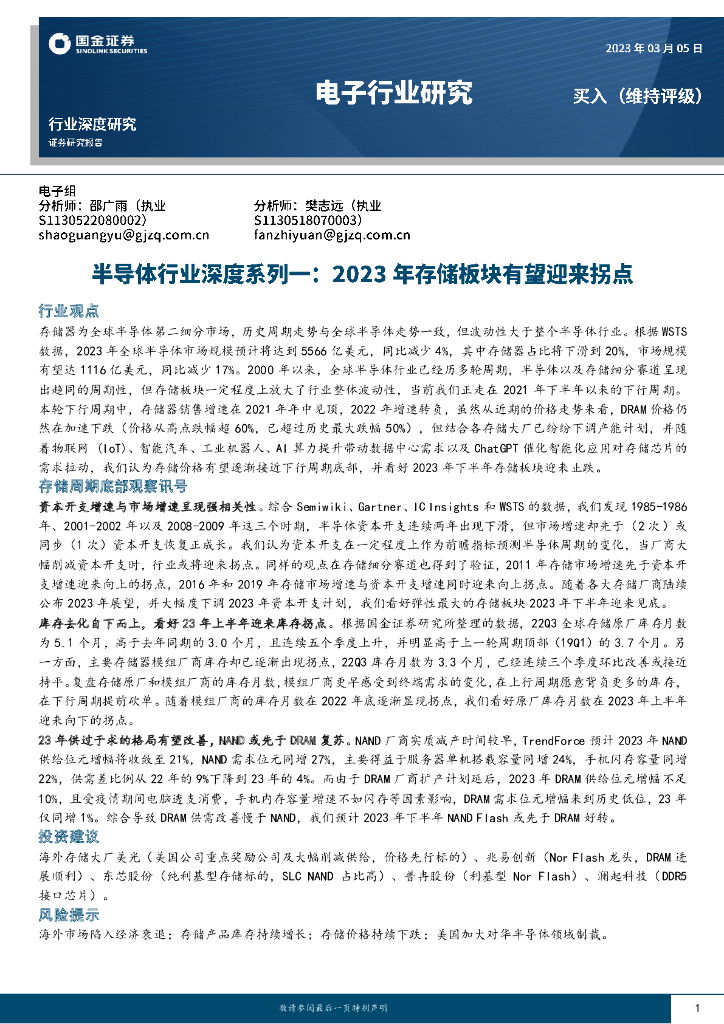 国金证券:电子行业研究:半导体行业深度系列一:2023年存储板块有望迎来拐点.pdf