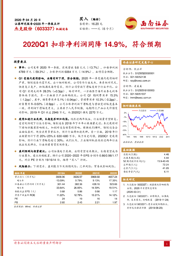 西南证券:杰克股份(603337)-2020Q1扣非净利润同降14.9%,符合预期.pdf