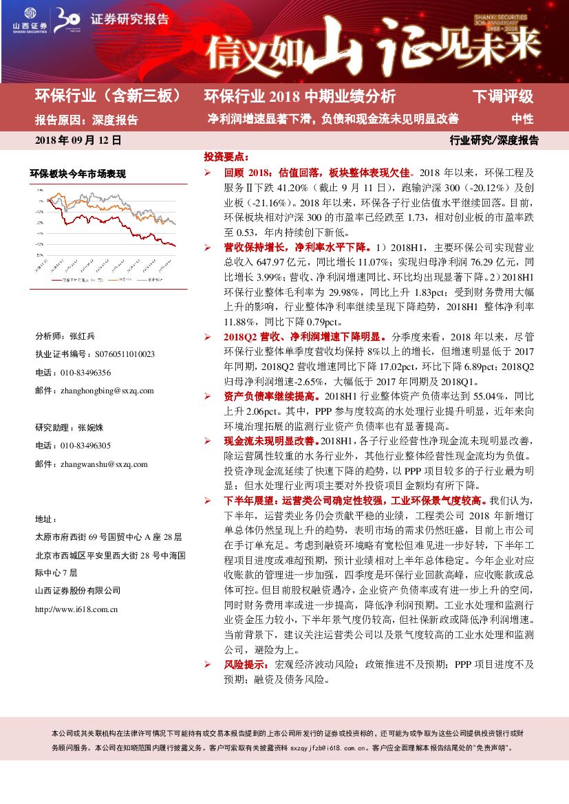 山西证券:环保行业2018中期业绩分析:净利润增速显著下滑,负债和现金流未见明显改善.pdf