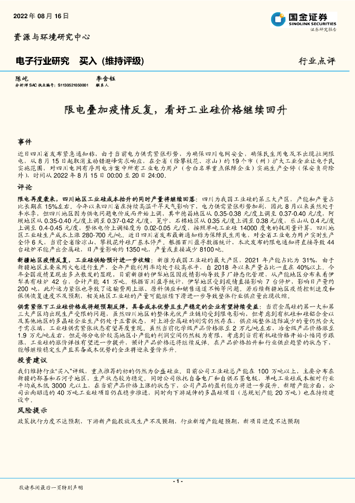 国金证券:电子行业研究:限电叠加疫情反复, 看好工业硅价格继续回升.pdf