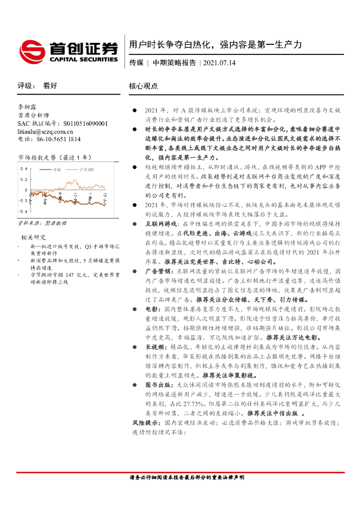 首创证券:传媒中期策略报告:用户时长争夺白热化,强内容是第一生产力.pdf