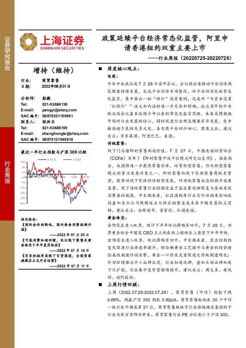 上海证券:商贸零售行业周报:政策延续平台经济常态化监管,阿里申请香港纽约双重主要上市.pdf