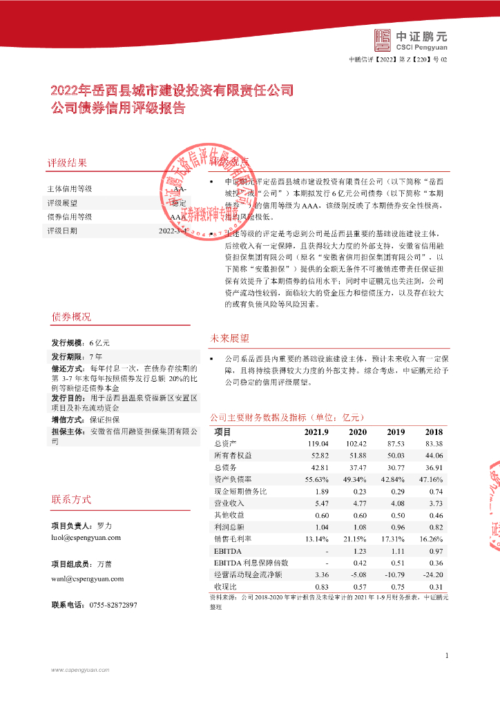 鹏元:2022年岳西县城市建设投资有限责任公司公司债券信用评级报告.pdf