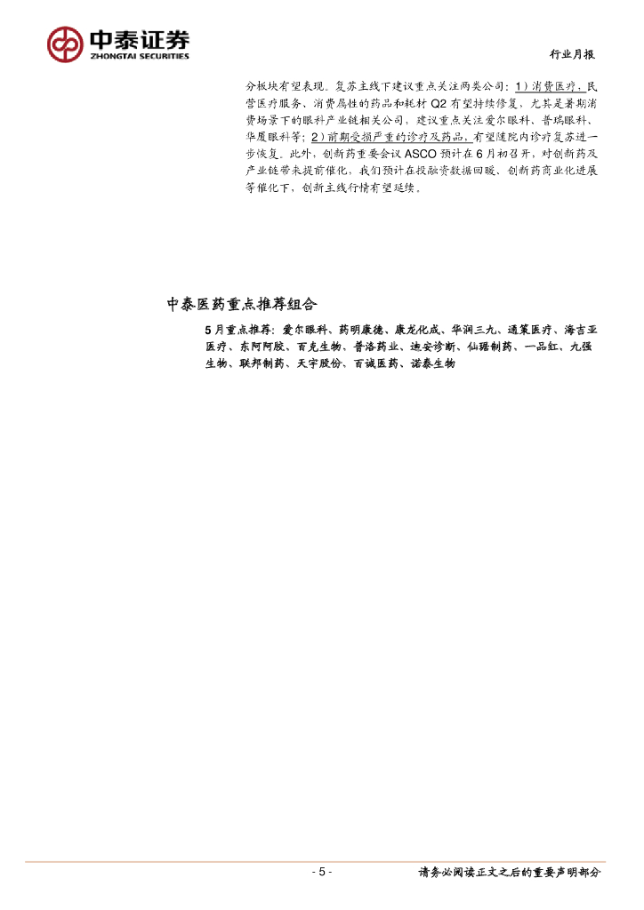 中泰证券:医药生物5月月报暨年报/一季报总结:疫情基本出清,业绩保持韧性;看好创新和复苏双主线.pdf