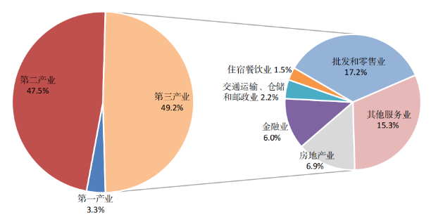 初步核算,2021年全市生产总值(GDP)6795亿元,按可比价格计算,比上年增长8.7%;与2019年相比,两年平均增长6.0%。分产业看,第一产业增加值227亿元,增长2.5%,两年平均增长2.3%;第二产业增加值3228亿元,增长10.7%,两年平均增长6.2%;第三产业增加值3340亿元,增长7.4%,两年平均增长6.2%。人均地区生产总值为127875元(按年平均汇率折算为19821美元),比上年增长7.9%。三次产业结构由上年的3.7:45.4:50.9调整为3.3:47.5:49.2。