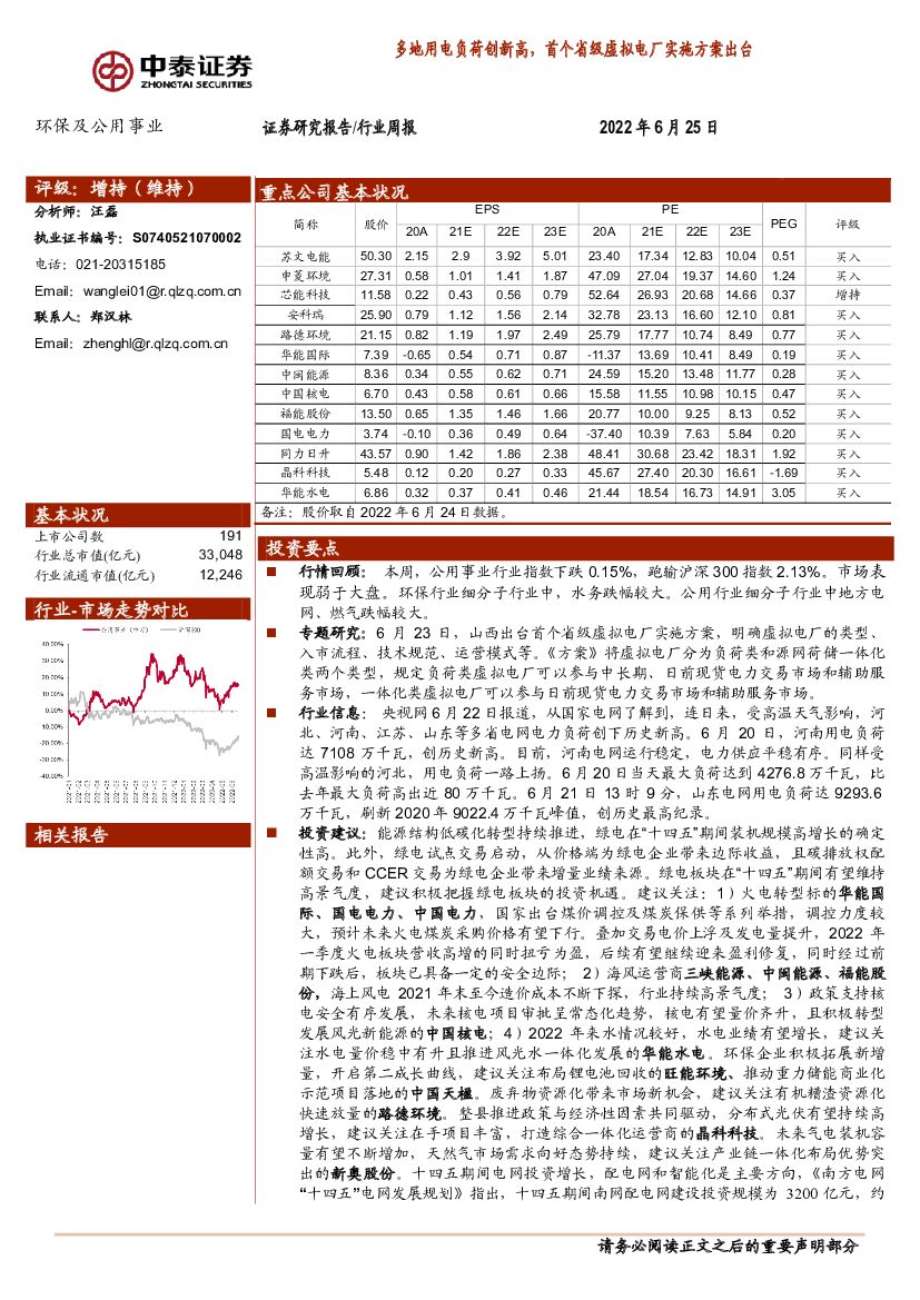 中泰证券:环保及公用事业行业周报:多地用电负荷创新高,首个省级虚拟电厂实施方案出台.pdf