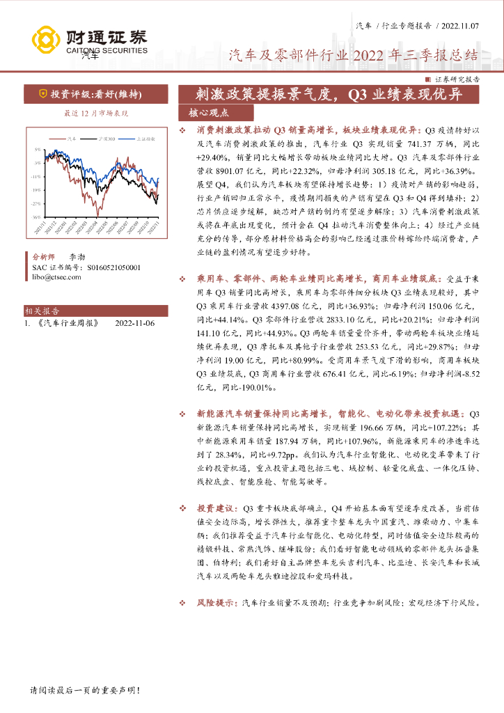 财通证券:汽车及零部件行业2022年三季报总结:刺激政策提振景气度,Q3业绩表现优异.pdf