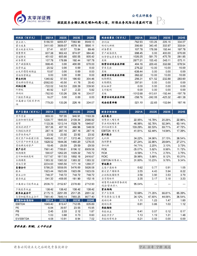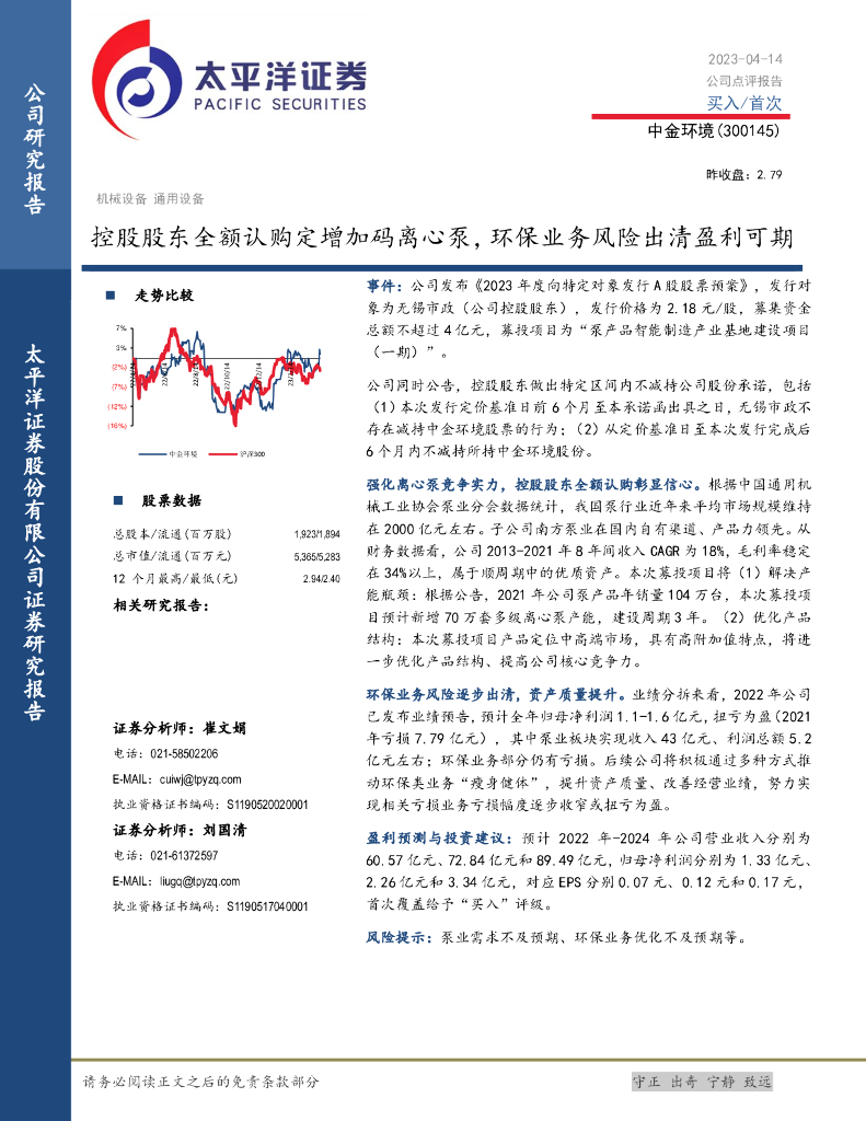 太平洋证券:中金环境(300145)-控股股东全额认购定增加码离心泵,环保业务风险出清盈利可期.pdf