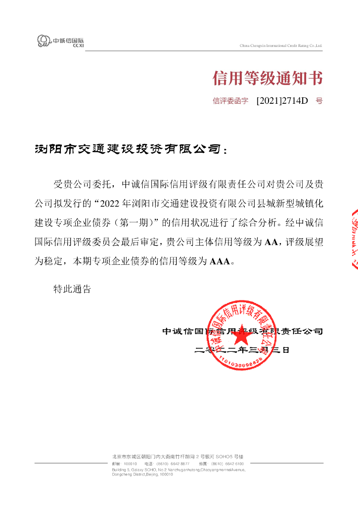 中诚信:2022年浏阳市交通建设投资有限公司县城新型城镇化建设专项企业债券(第一期)信用评级报告.pdf