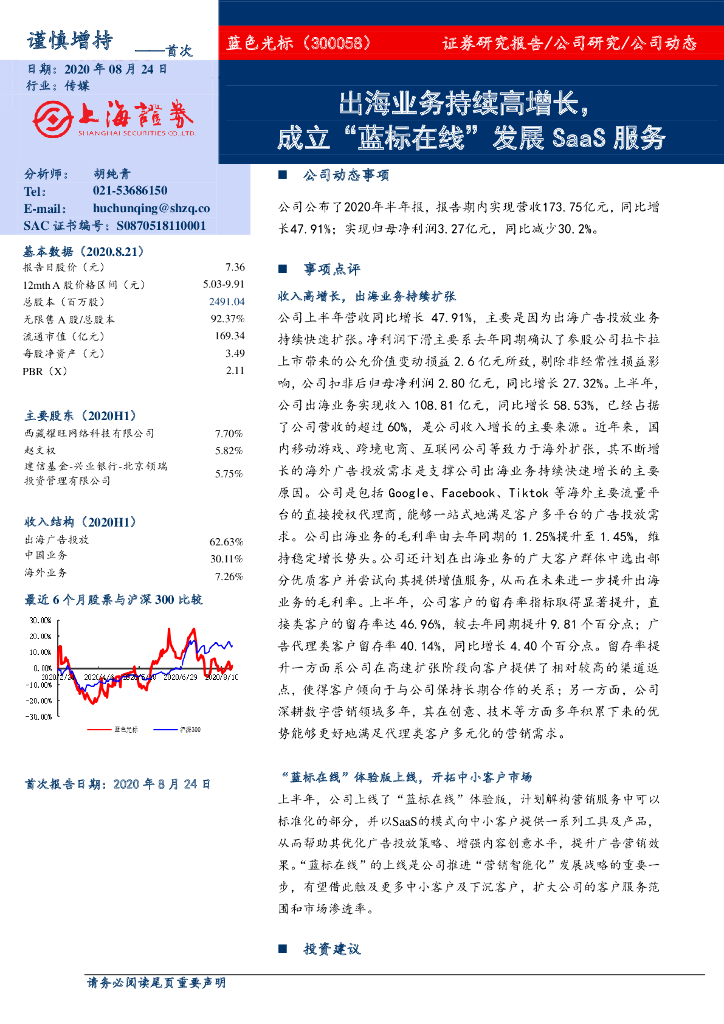 上海证券:蓝色光标(300058)-出海业务持续高增长,成立“蓝标在线”发展SaaS服务.pdf