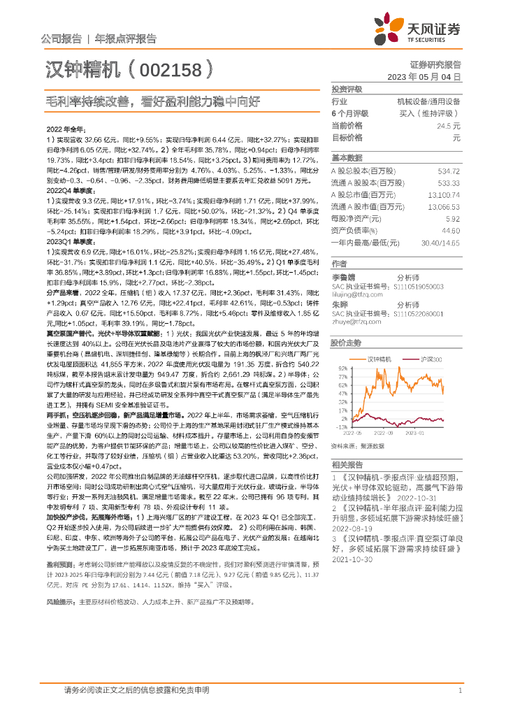 天风证券:汉钟精机(002158)-毛利率持续改善,看好盈利能力稳中向好.pdf