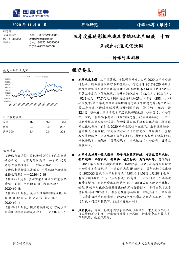国海证券:传媒行业周报:三季度落地影视院线及营销环比呈回暖 十四五提出打造文化强国.pdf